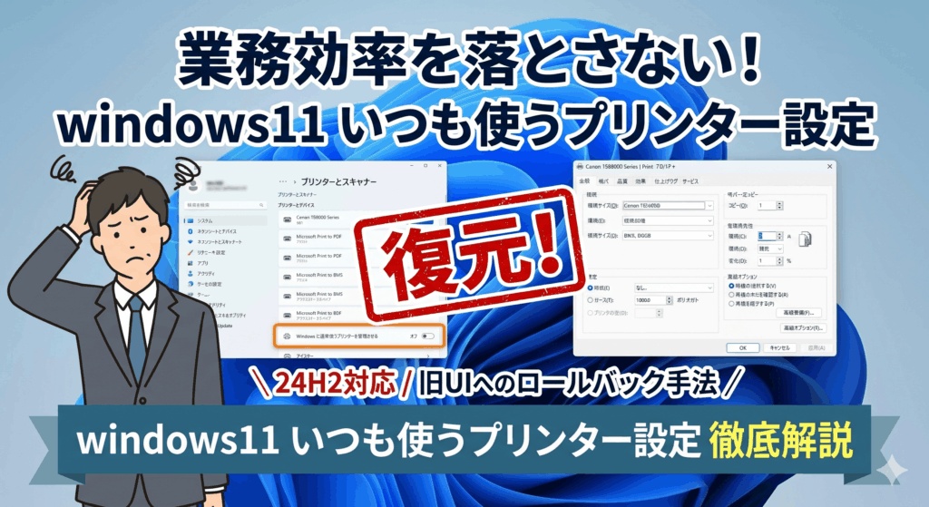 Windows 11の設定を自分好みにカスタマイズして、作業効率をグンと上げたいところですよね。でも、印刷しようとした時に「いつも使うプリンター設定」がいつの間にか変わっていて、意図しないデバイスから出力されそうになった経験はありませんか?実はこれ、Windows 11の標準機能がユーザーの利便性を考えて良かれと思って動いている結果なんです。でも、特定のプリンターを常に使いたいあなたにとっては、少しお節介な機能に感じてしまうかもしれませんね。
